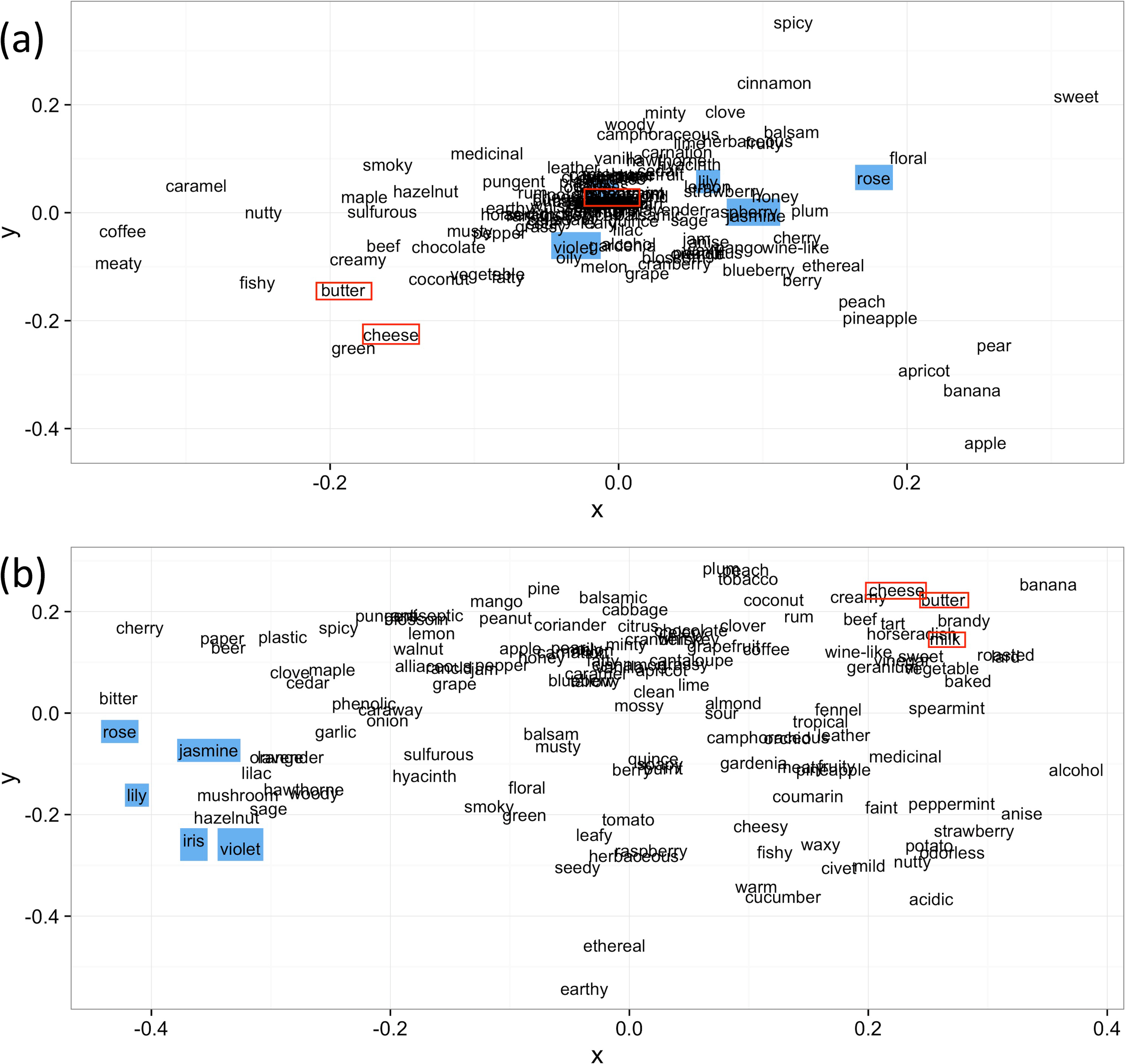 It was confirmed that the calculated similarities between the descriptors were greatly different between the two methods. As shown in Fig 3(B), in the two-dimensional diagram obtained from Word2Vec, descriptors such as “rose”, “jasmine”, “lily”, “iris”, and “violet”, and descriptors such as “milk”, “cheese”, and “butter” are placed closer than in the diagram based on the dissimilarity matrix calculated from the correlation coefficient (Fig 3(A)).