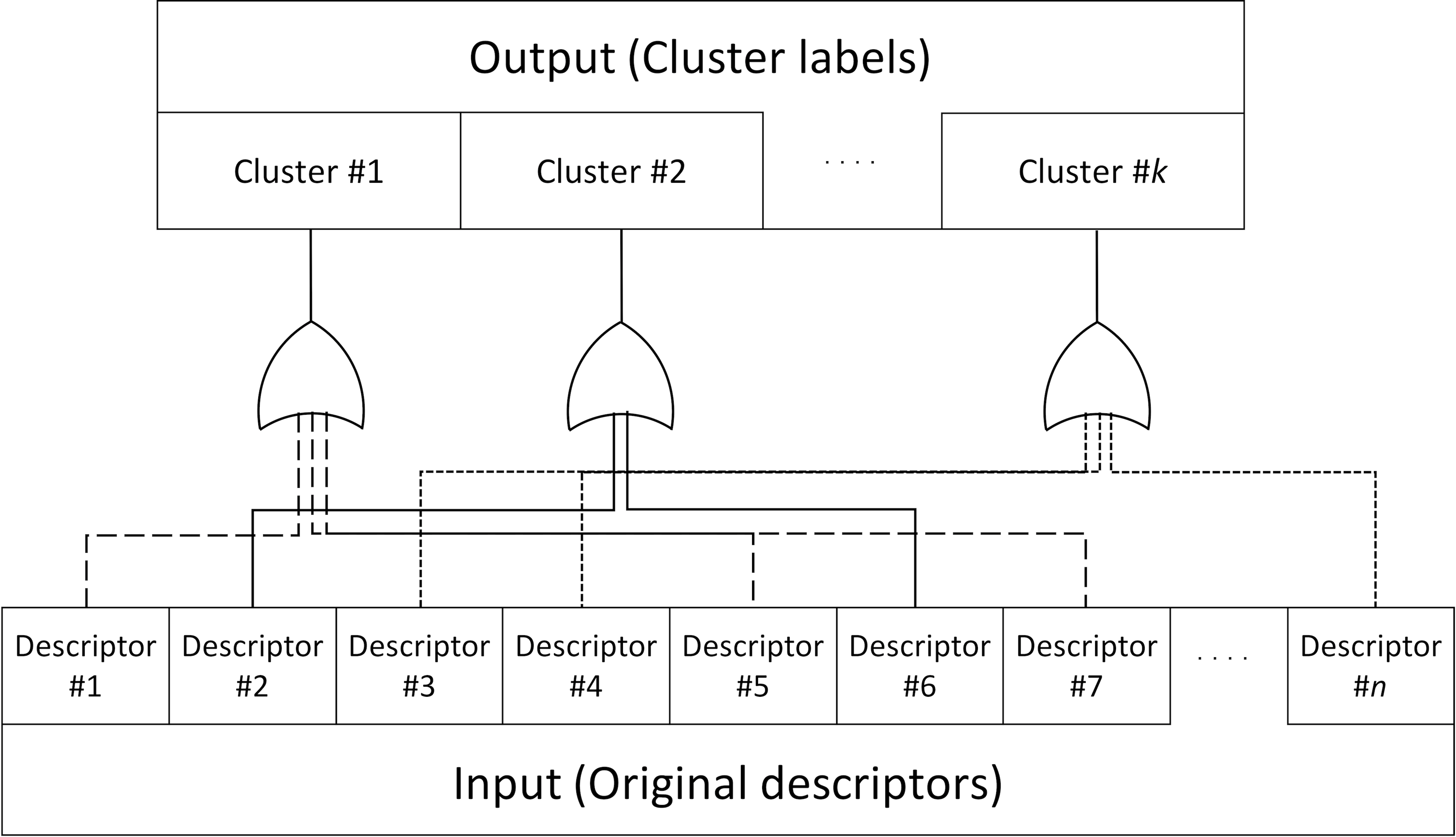 Fig. 4 shows the predictive model with clustering procedure. When any of the descriptors in a cluster has a value of 1, the value of the corresponding cluster that includes the sample is set to 1.
